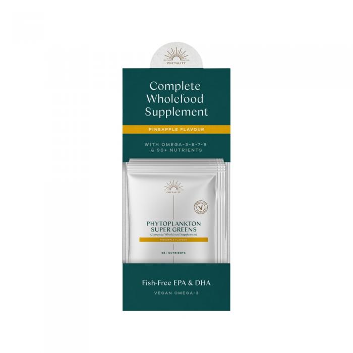 Phytoplankton Super Greens is a powerful daily supplement packed full of alkaline superfoods, antioxidants, adaptogens, probiotics and ULTANA Phytoplankton. Nourish your body with a variety of detoxifying greens including wheatgrass, barley grass, spirulina, chlorella and alfalfa. Boost your vitality with ULTANA Phytoplankton, a plant-based wholefood source of omega-3 EPA & DHA and vitamin B12. The unique lipid structure of ULTANA Phytoplankton – containing phospholipids and glycolipids – is proven to help your body absorb three times the amount of omega-3 compared to fish or algal oils. ULTANA also contains omegas 6, 7 and 9.
