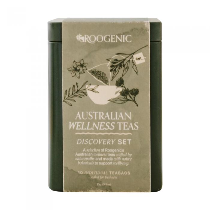 A selection of Roogenic's Australian wellness teas crafted by naturopaths and made with native botanicals to support wellbeing.