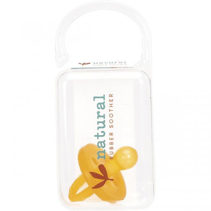 One(1) Round/Cherry Natural Rubber Soother in a reusable case allowing for convenient and hygienic storage.